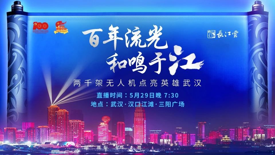 5月29日由中共武汉市委宣传部指导,新洲区委区政府支持,武汉万达城市公司主办的“百年流光 和鸣于江两千架无人机点亮英雄武汉”直播活动在汉口江滩三阳广场盛大启幕!长江之滨徐徐展画卷尽述武汉这座历史名城的辉煌历程