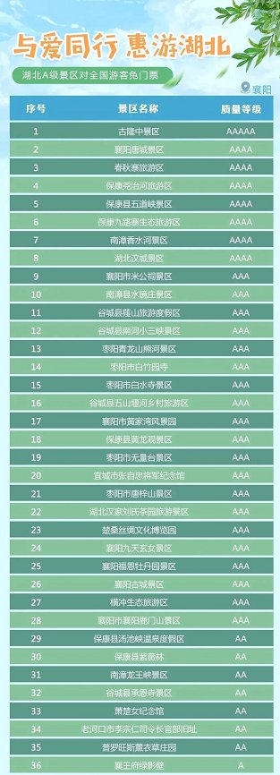 2020年8月8日起,湖北全部A级景区面向全国游客免门票开放。