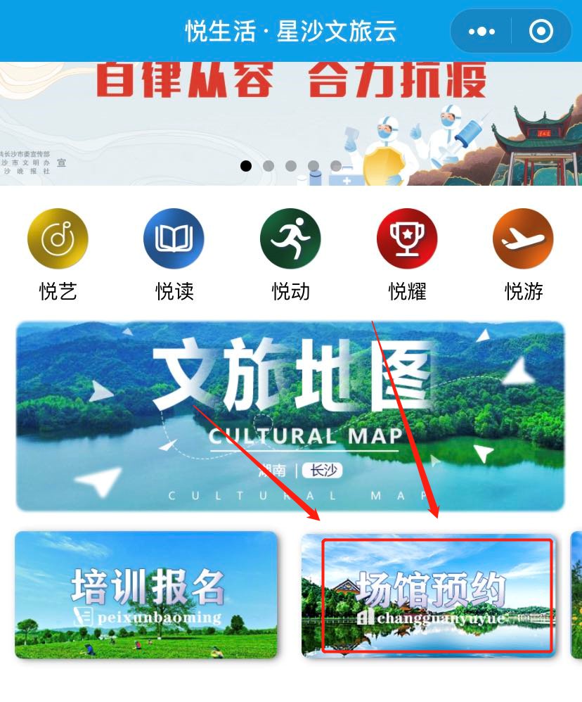 第一步在星沙文旅云平台首页点击【场馆预约】,选择想要预约的场馆;