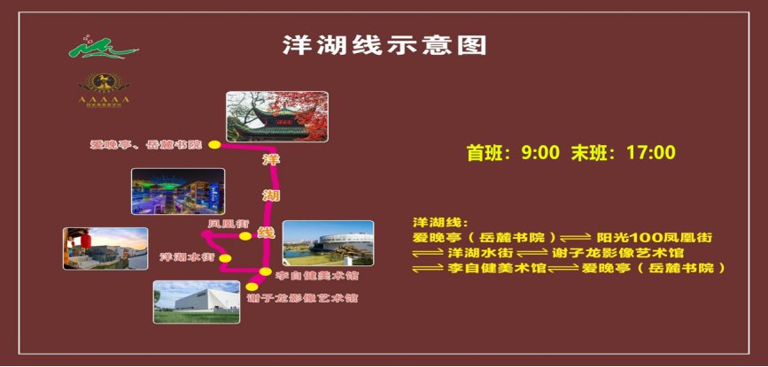 线路:岳麓山爱晚亭(岳麓书院)→阳光100凤凰街→洋湖水街→李自健美术馆→谢子龙影像艺术馆