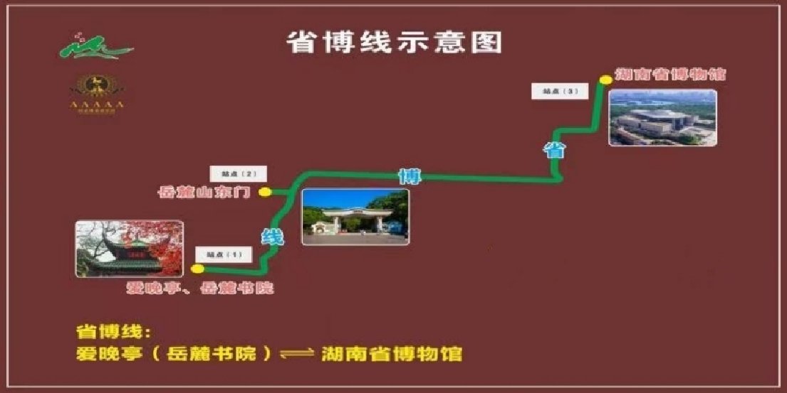 线路:岳麓山爱晚亭(岳麓书院)⇌岳麓山东门(停车场)⇌湖南省博物馆