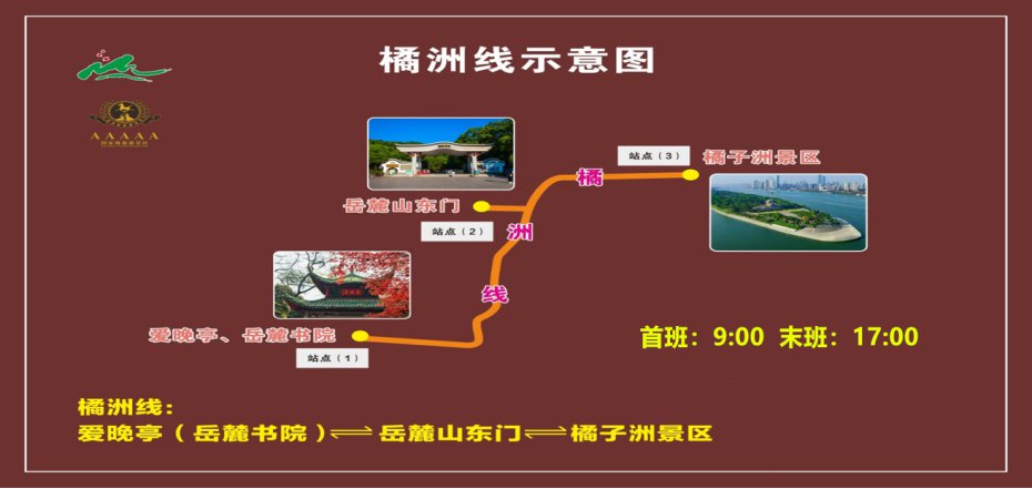 线路:岳麓山爱晚亭(岳麓书院)⇌岳麓山东门(停车场)⇌橘子洲景区