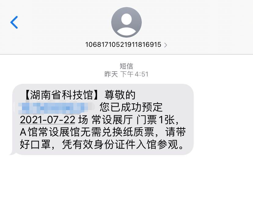 湖南省科技馆预约短信内容不同的展厅会有不同的提示,小编以常设展厅为例,收到的预约短信内容如下: