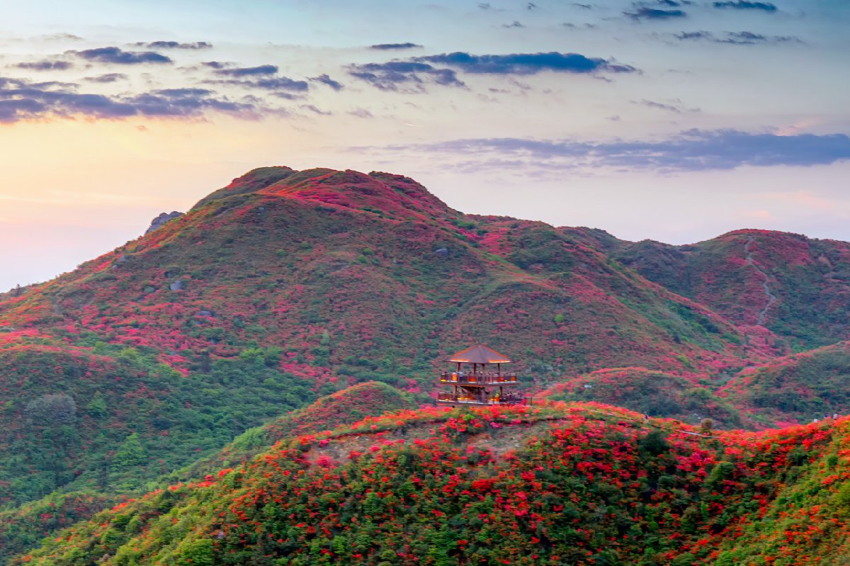 大围山杜鹃花的种类、群落分布广泛,有成片、有散状,尤其在七星岭、红莲寺、五指石景区海拔1200米以上的溪谷及坡顶最为密集,形成了蔚为壮观的杜鹃花海景观。
