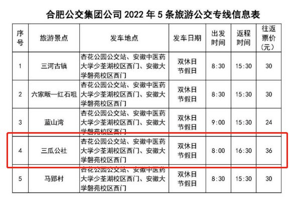 为改善合肥市周边部分县区旅游景点公共交通环境,进一步服务合肥市民前往有关旅游景点观光休闲,合肥公交集团公司于3月5日起,每逢双休日、节假日开行市区到三河古镇、蓝山湾、三瓜公社、六家畈—红石咀公园、马郢村的5条旅游公交专线。