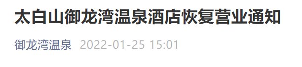 疫情期间,为配合政府疫情防控需求,以及考虑到游客出行安全方面,太白山御龙湾温泉酒店于2021年12月25日至2022年1月25日进行歇业处理。