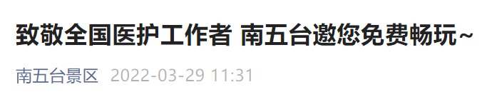 全国医护人员可凭本人有效证件(医师证、护士证等)享受南五台景区免门票优惠。