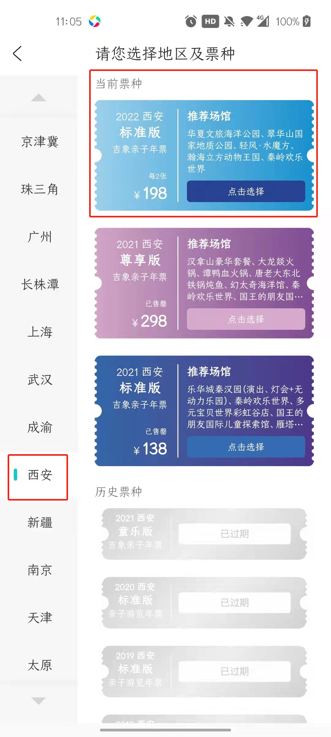 第二步:进入“亲子年票”APP,选择【西安】区域和【西安2022亲子年票】