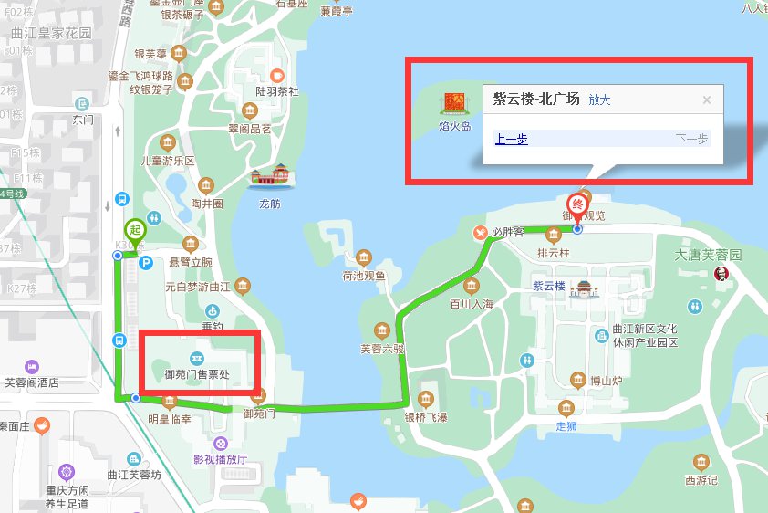 游客由大唐芙蓉园西门(御苑门)进入景区,然后步行至紫云楼北广场。具体线路如图: