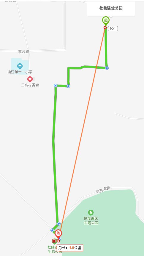 杜邑遗址公园—月亮湾路—杜陵遗址公园(步行距离大约1.9公里)
