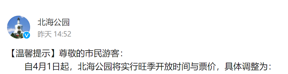 4月1日起北京北海公园实行旺季开放时间与票价通知
