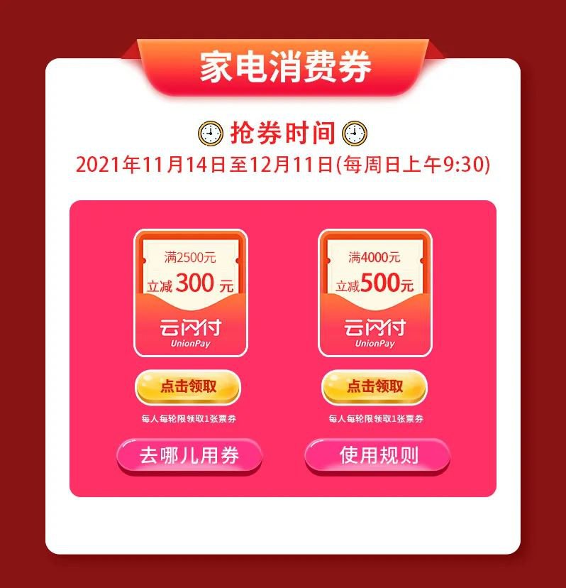 (2)500元家电消费券。满4000减500元。每人每轮限领取1张票券。