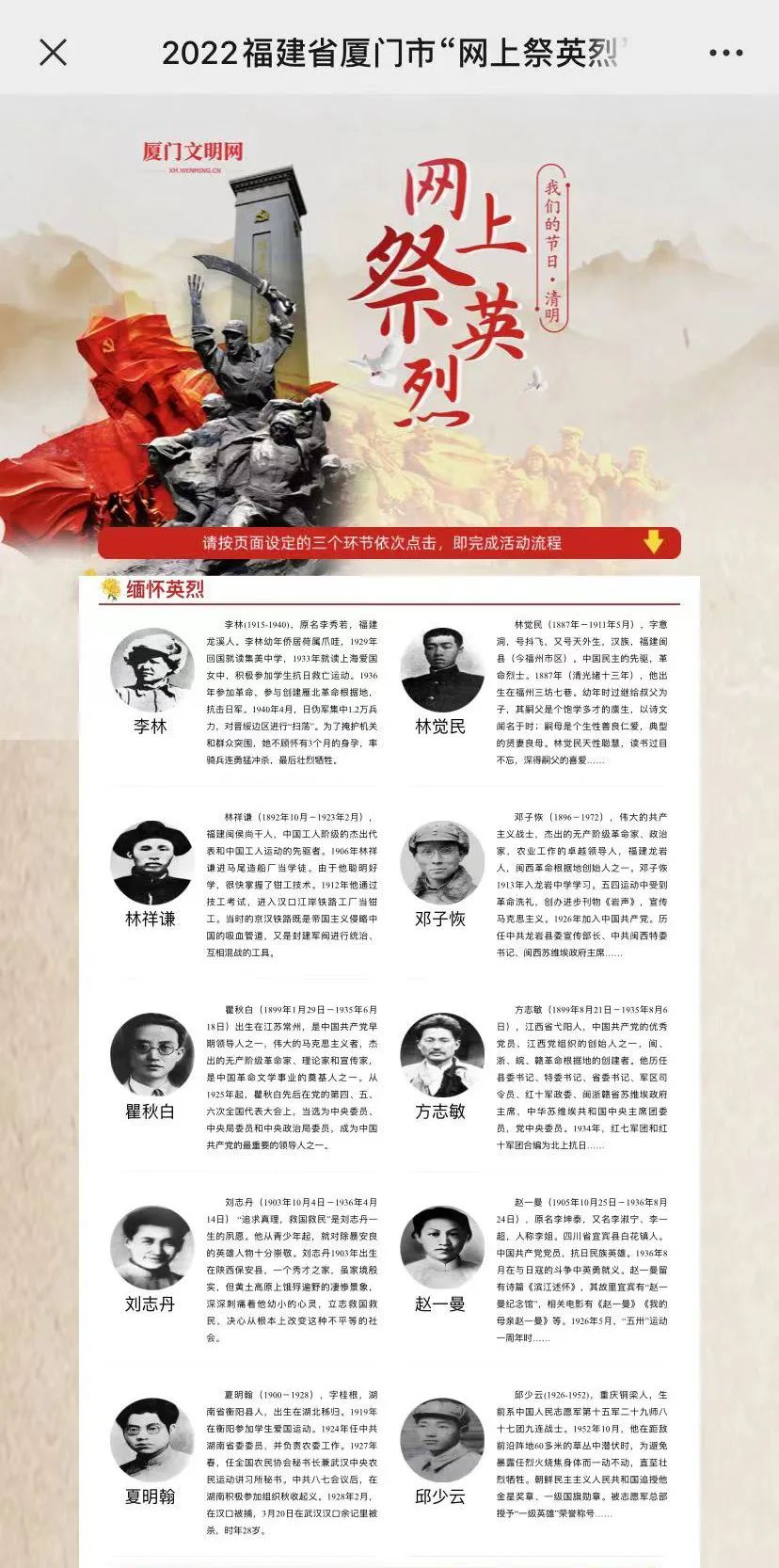 登陆厦门文明网进入“网上祭英烈”专题 或直接打开官网网址:点击进入