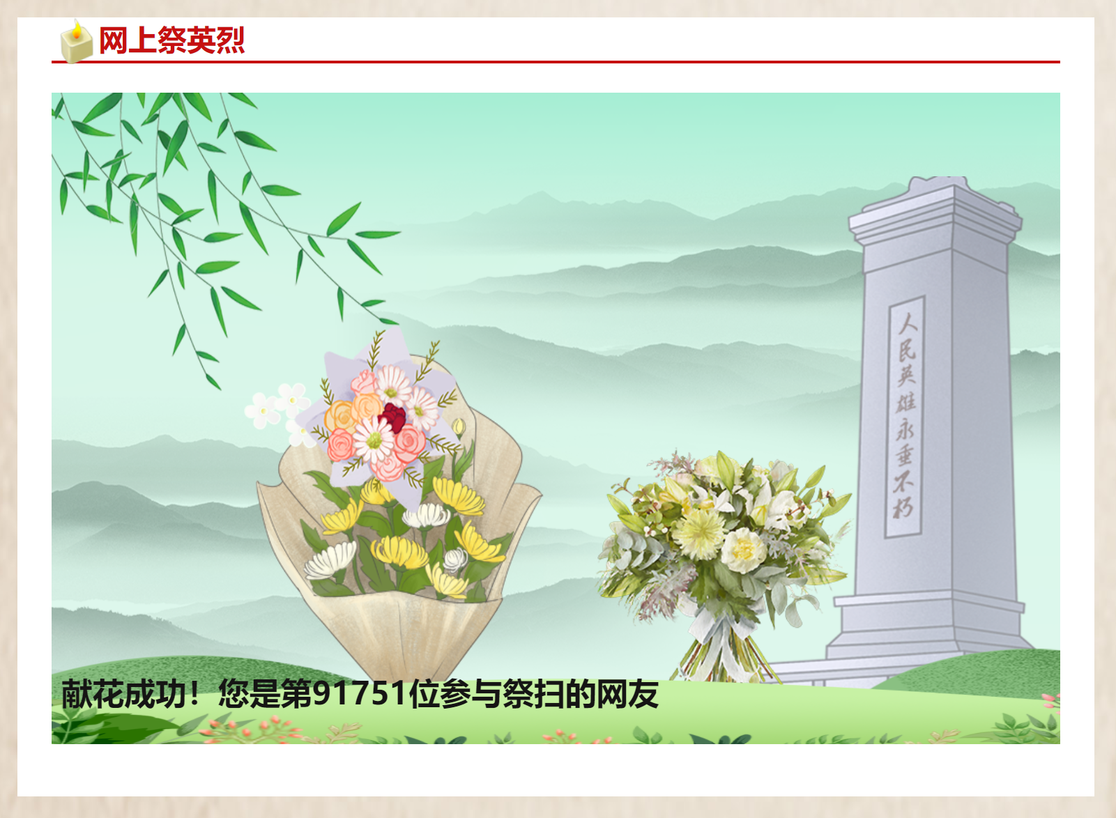 (2)点击图片中的花篮,为英烈献花,并写下留言寄语,寄托哀思↓