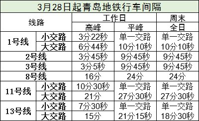 根据近期疫情防控形势,结合客流变化,自3月28日起,青岛地铁1、8、13号线部分时段压缩行车间隔: