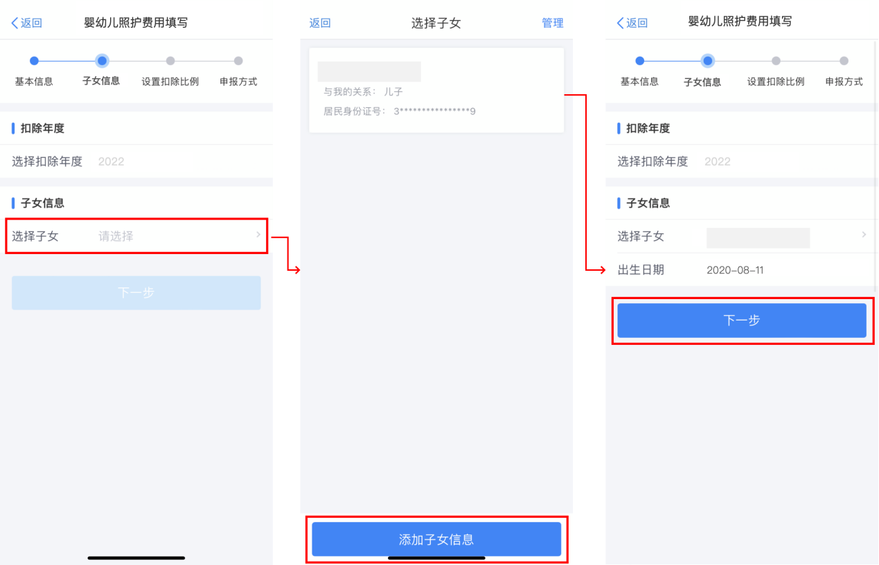 纳税人选择子女后,将回到“子女信息”界面,并显示子女的姓名与出生日期,子女信息确认无误后,点击“下一步”。