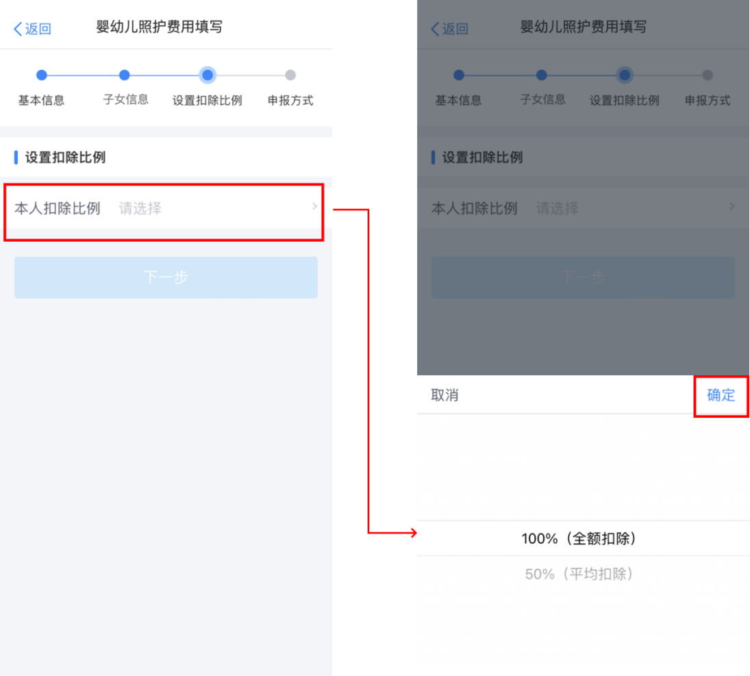 第四步,设置扣除比例。完成子女信息填写后,纳税人根据实际情况在“本人扣除比例”中选择100%(全额扣除)或50%(平均扣除)其中一种。选择完成并确定后,点击“下一步”。