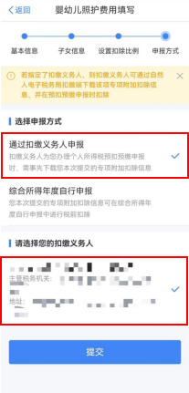第五步,选择申报方式。设置扣除比例后,进入“申报方式”界面,纳税人可根据实际情况选择“通过扣缴义务人申报”或“综合所得年度自行申报”任意一种方式。如果纳税人需要在每月发放工资薪金时享受专项附加扣除,需要选择“通过扣缴义务人申报”,并核实扣缴义务人信息是否准确。选择完成后,点击“提交”,即完成3岁以下婴幼儿照护专项附加扣除填报流程,系统将弹出“专项附加扣除信息已提交”的提示。纳税人可以点击“查看填报记录”查看已经申报的专项附加扣除信息。
