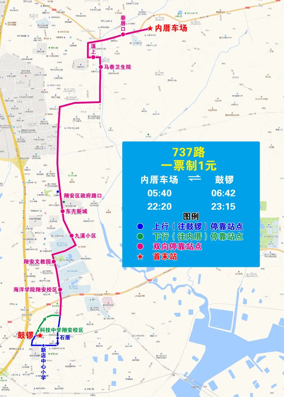 下行:鼓锣、科技中学翔安校区、海洋学院翔安校区、翔安文教园、九溪小区、东方新城、翔安区政府路口、马巷卫生院、溪上、蔡厝口、内厝车场。