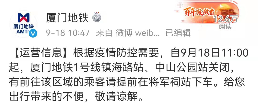 根据疫情防控需要,自9月18日11:00起,厦门地铁1号线镇海路站、中山公园站关闭,有前往该区域的乘客请提前在将军祠下车。
