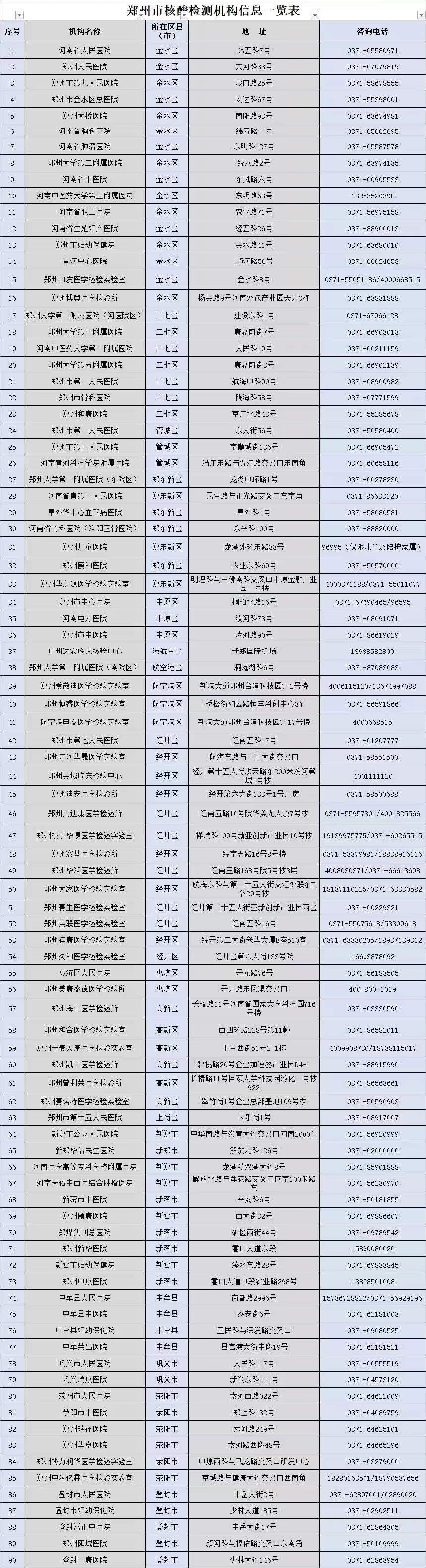 1. 郑州市核酸检测机构信息一览表