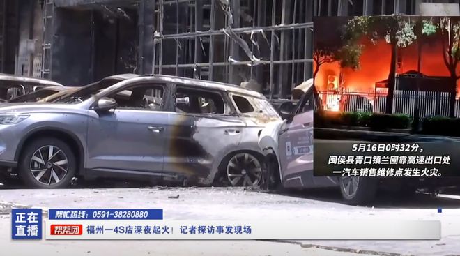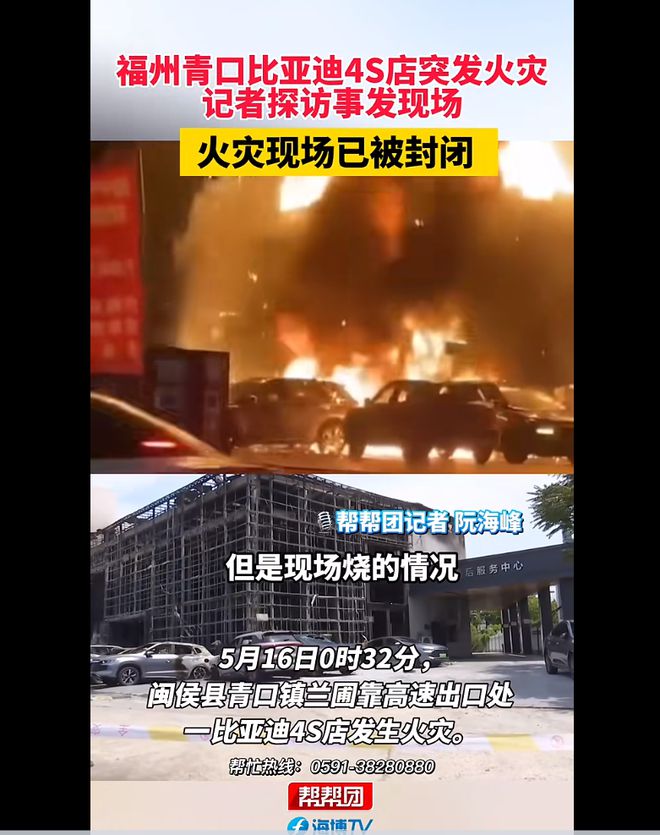 另外,据荆州日报冷暖视频报道,5月16日,福建福州闽侯县内比亚迪青口4S店发生火灾,火势迅猛,火光冲天并伴有巨响。事发后,当地消防迅速赶到现场展开救援工作。对此,闽侯县消防救援大队工作人员称,没有人员受伤,起火原因还在调查中。尚干镇政府工作人员称,火灾确实发生在比亚迪店内,没有人员伤亡,火已经被扑灭了。