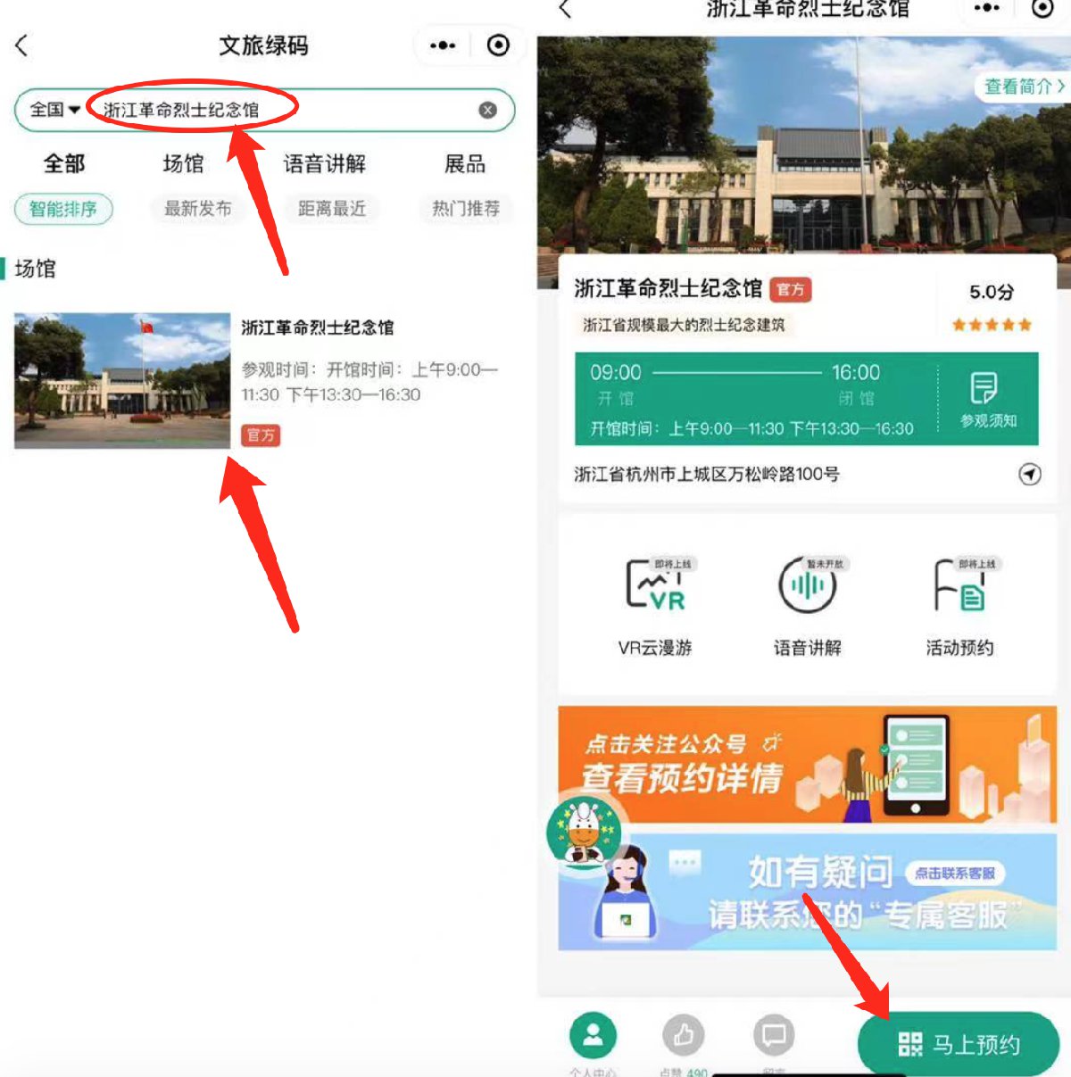 1、点这,长按进入文旅绿码小程序,在搜索框输入“浙江革命烈士纪念馆”,点击第一个进入,然后点击右下角“马上预约”