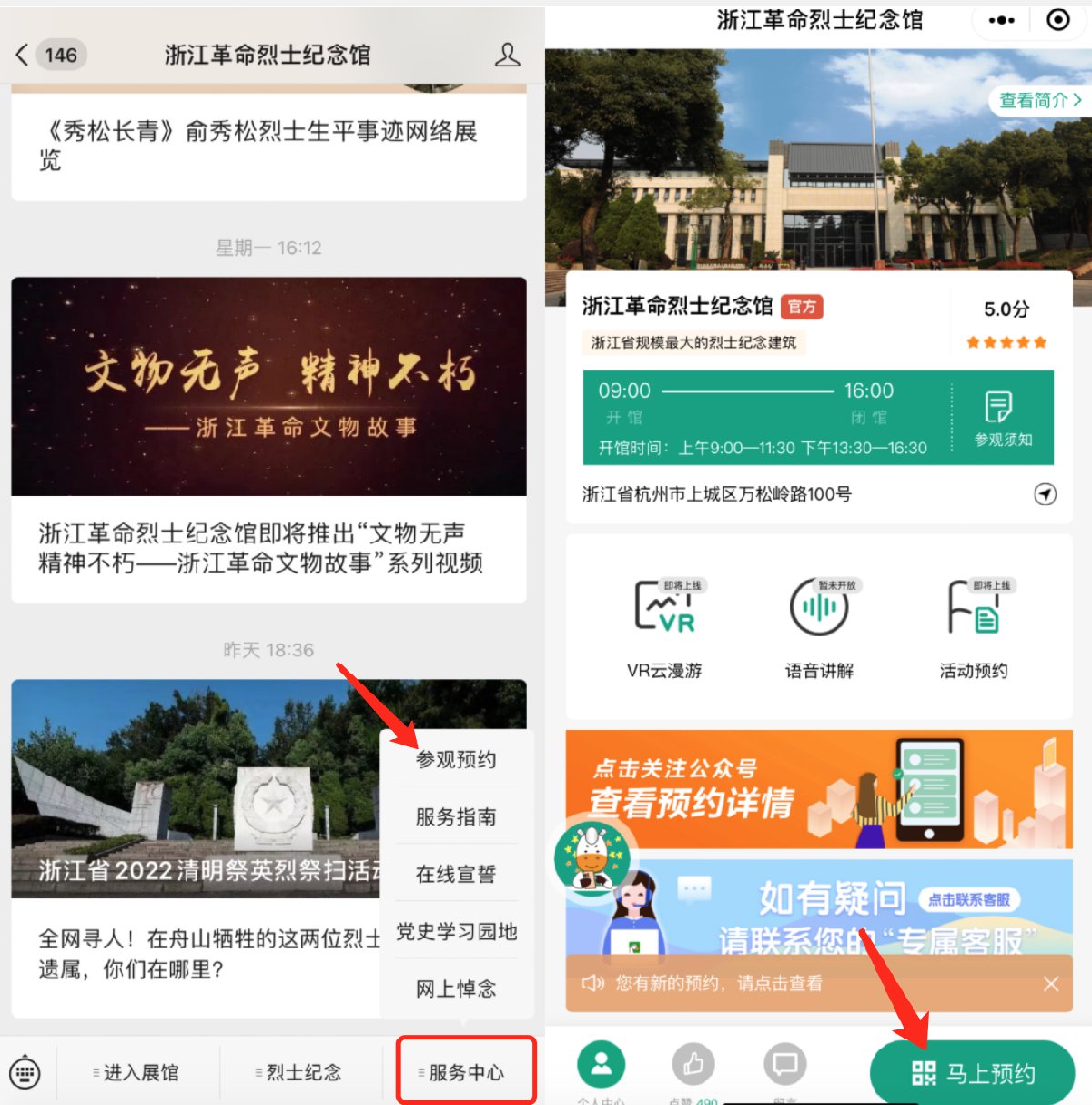1、关注“浙江革命烈士纪念馆”官方公众号,点击菜单栏“服务中心”-“场馆预约”,然后进入下一页面,点击“马上预约”。