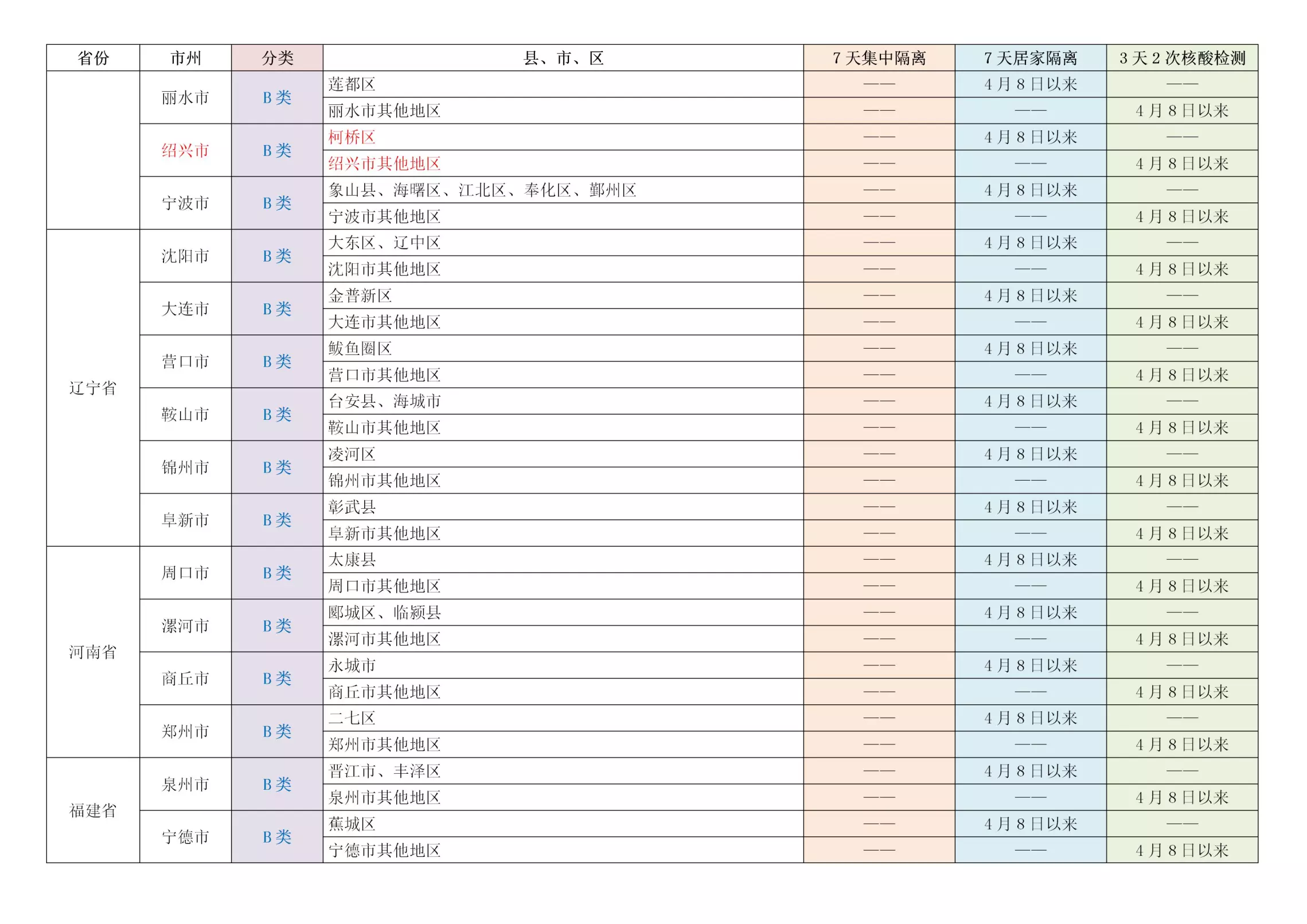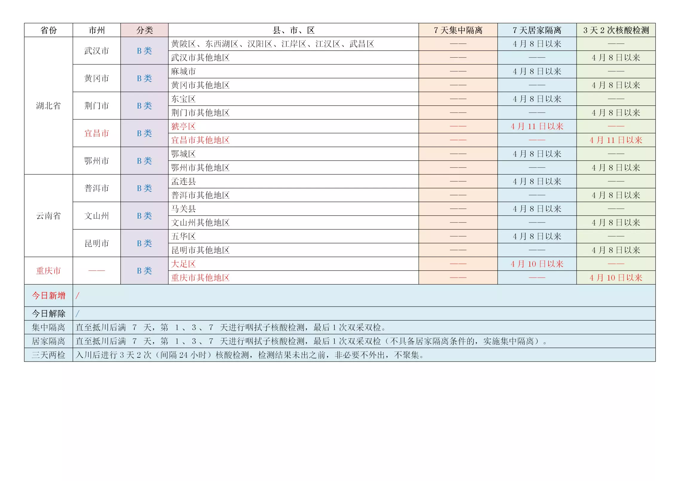 自4月15日起,四川省根据风险大小,将国内有本土疫情发生的地市(包括地级市、省会城市、直辖市划分为A类地区(疫情输入我省风险高的地市)、B类地区(除A类地区外,有本土疫情发生的省外其他地市),实行分类管控。