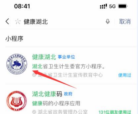 第一步:打开微信,搜索小程序“健康湖北”。