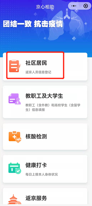 1、进入京心相助小程序,选择“社区居民”(需先登录)