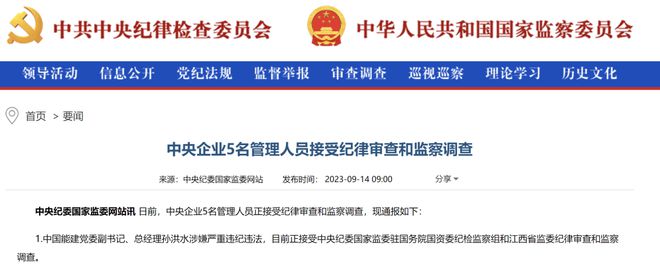 据中央纪委国家监委网站9月14日消息,中国能建党委副书记、总经理孙洪水涉嫌严重违纪违法,目前正接受中央纪委国家监委驻国务院国资委纪检监察组和江西省监委纪律审查和监察调查。