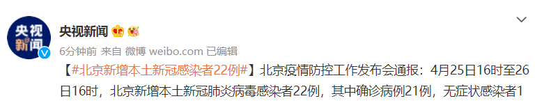 ➤具体信息:4月25日16时至26日16时,北京新增本土新冠肺炎病毒感染者22例,其中确诊病例21例,无症状感染者1例。朝阳区9例、房山区7例、顺义区2例、昌平区2例、丰台区和延庆区各1例。