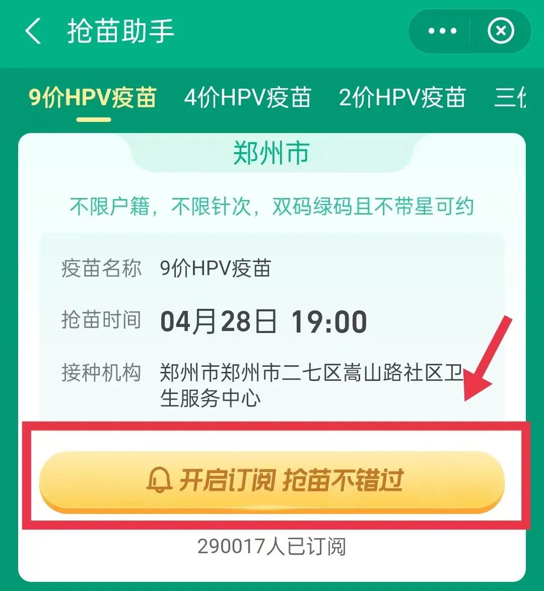 郑州市二七区嵩山路社区卫生服务中心250人份九价HPV疫苗,将于4月28日19:00开放线上预约。