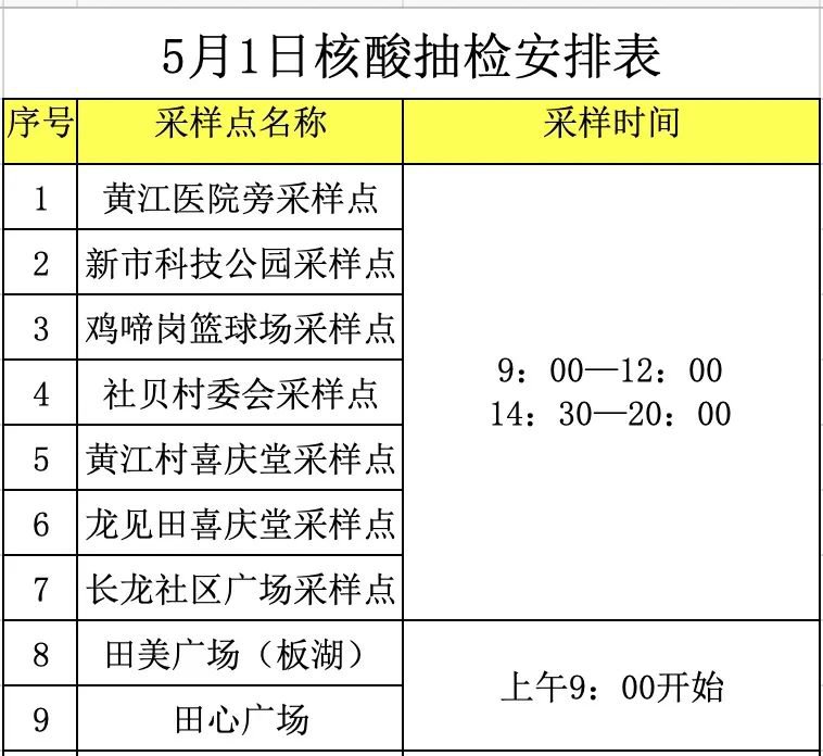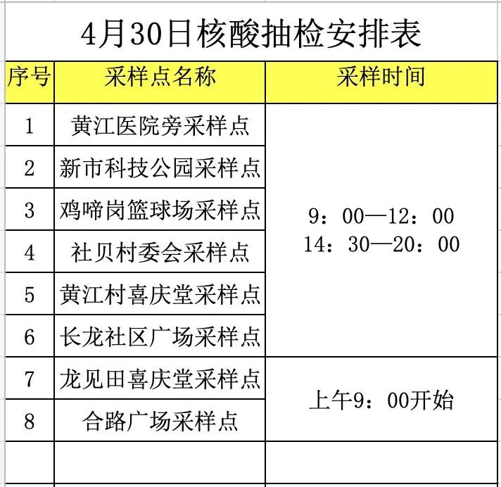 根据工作安排,黄江镇将于4月30日至5月1日,连续两天开展重点场所、重点人群免费核酸检测工作,具体安排如下: