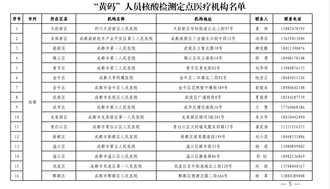 答:目前各县(市、区)均设有“黄码”人员核酸检测定点医院,最新名单可在四川天府健康通“医疗防疫机构查询”模块中查询,也可咨询当地卫生健康行政部门。