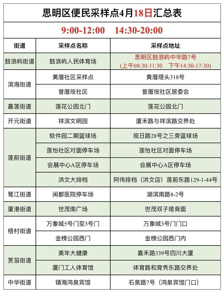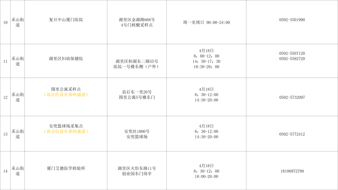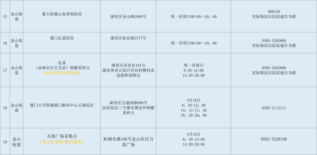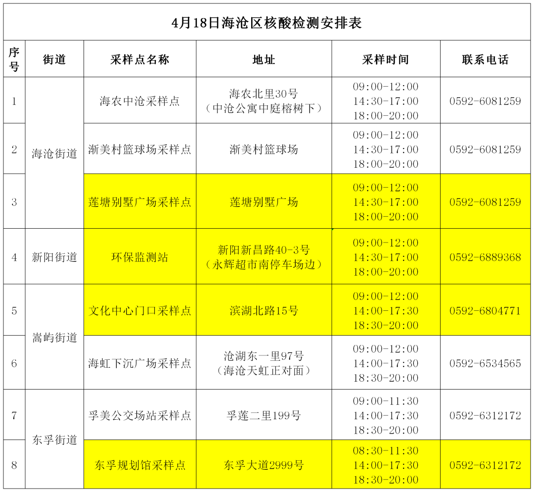 温馨提醒:4月18日,海沧区安排8个便民核酸检测采样点,以下黄色底纹点位设置有黄码人员专用检测通道。