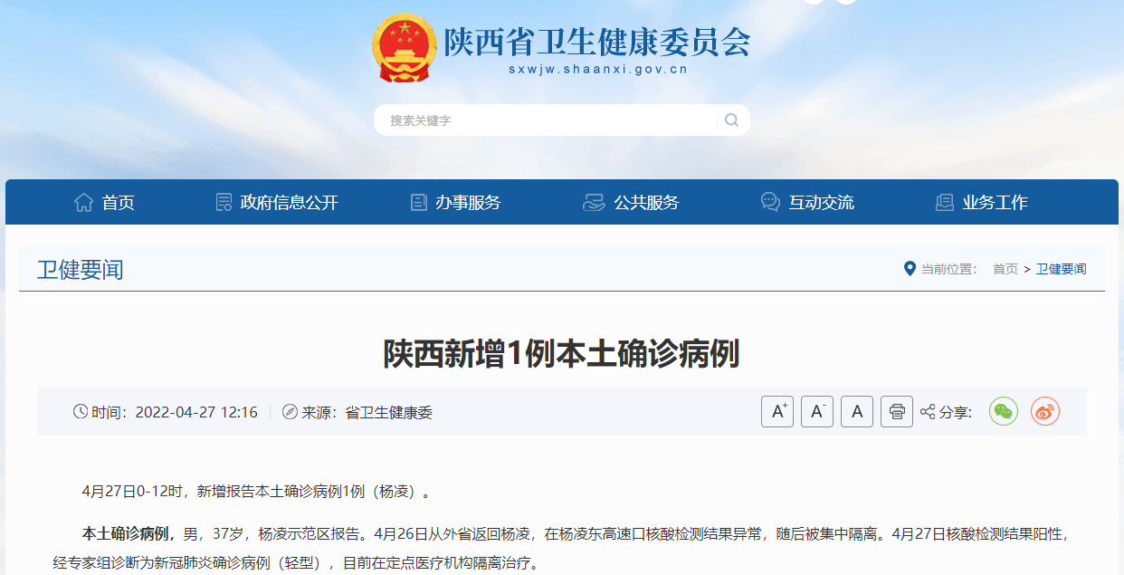 4月27日0-12时,杨凌新增报告本土确诊病例1例。