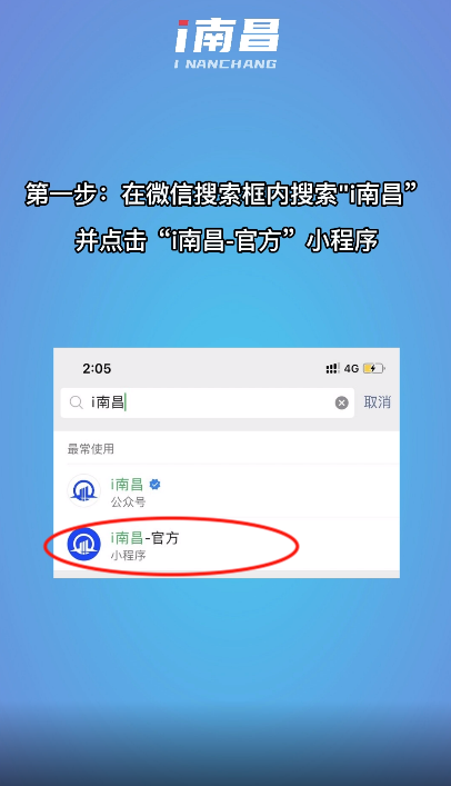 第一步:在微信搜索框内搜索“i南昌”并点击“i南昌-官方”小程序