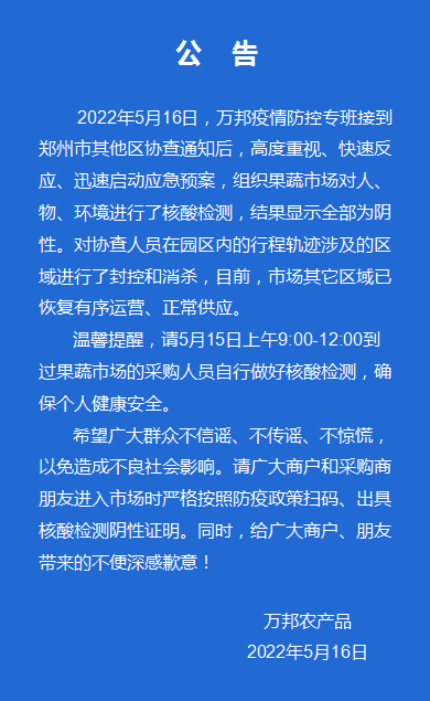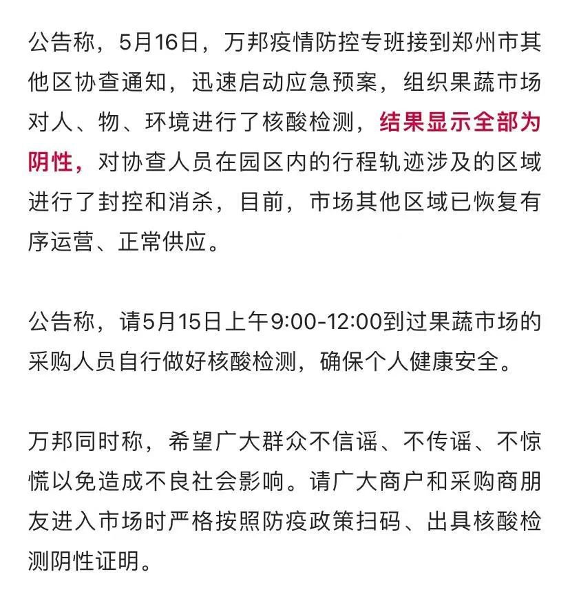 5月16日上午,郑州有微信群传出“万邦临时封控”的消息。5月16日晚,河南万邦国际农产品物流城发布公告辟谣。