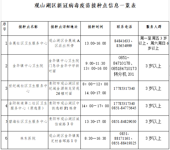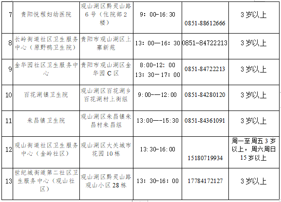 2.凡年满3-11周岁无相关禁忌症的人群均可前往接种点接种新冠病毒疫苗,接种时需监护人陪同。(观山街道、会展社区卫生服务中心2家单位因无儿科医生暂时不接种)