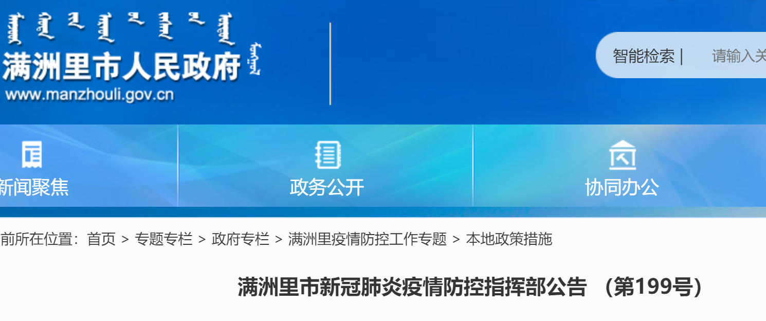 满洲里市新冠肺炎疫情防控指挥部公告 (第199号)