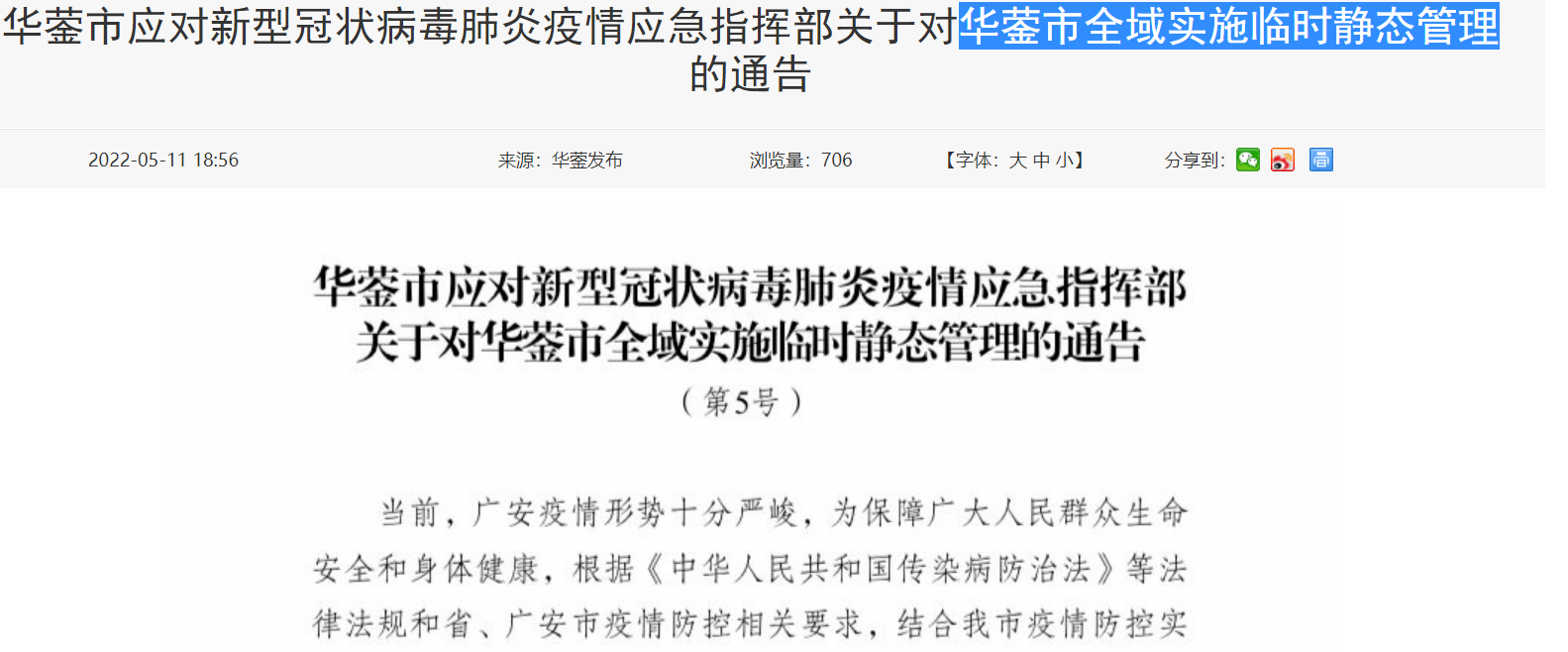 当前,广安疫情形势十分严峻,为保障广大人民群众生命安全和身体健康,根据《中华人民共和国传染病防治法》等法律法规和省、广安市疫情防控相关要求,结合广安市疫情防控实际,经市委应对新型冠状病毒肺炎疫情防控工作领导小组同意,自5月12日上午9时起,对华蓥市全域实施临时静态管理。现将有关事项通告如下: