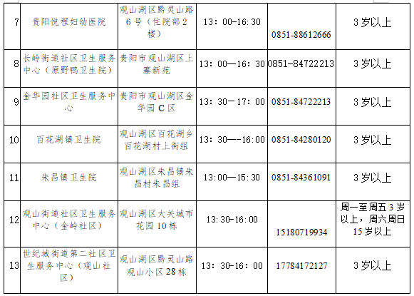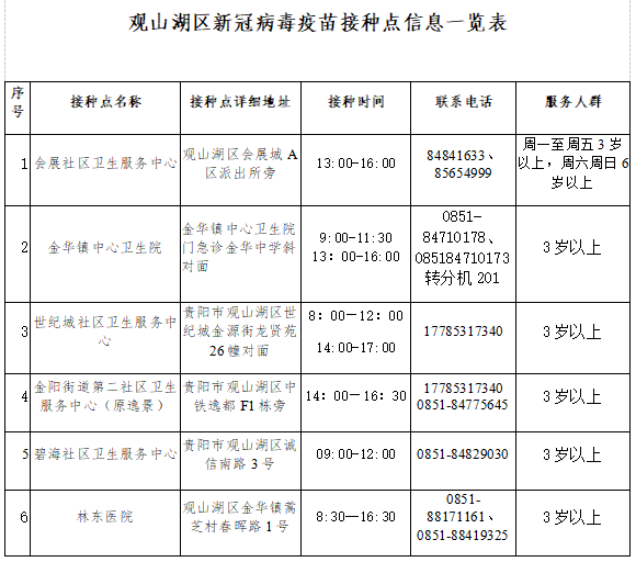 2.凡年满3-11周岁无相关禁忌症的人群均可前往接种点接种新冠病毒疫苗,接种时需监护人陪同。(观山街道、会展社区卫生服务中心2家单位因无儿科医生暂时不接种)