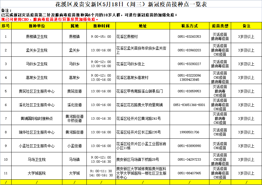一、花溪区、贵安新区5月18日(周三)新冠疫苗接种点一览表