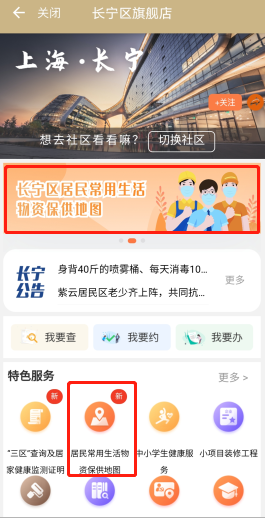方法1:使用手机打开“随申办市民云”APP,搜索“长宁旗舰店”,点击“长宁区居民常用生活物资保供地图”后查询。