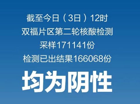 截至今日(31日)16时双福已完成现场采样170336人次累计送样146738份已检测出结果130213份均为阴性!