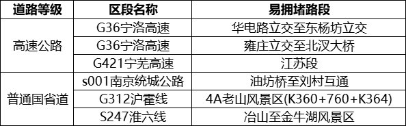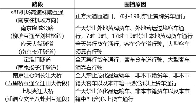 另外,中秋节假期期间,南京市高速公路对危化品运输车、大件运输车全路网、全时段禁行,部分重要路段、节点实施交通管制政策: