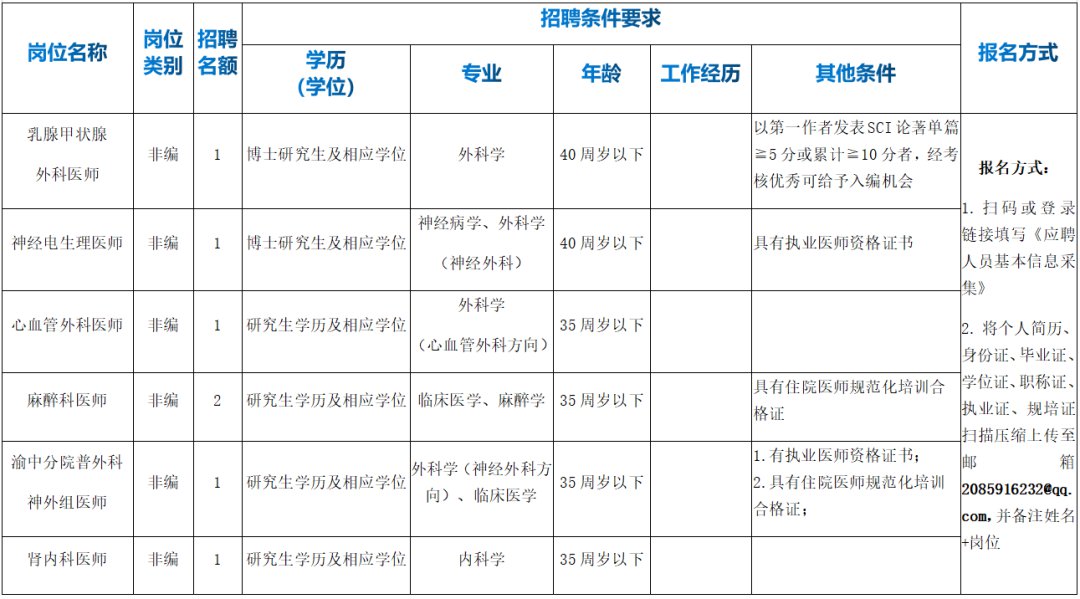 ②将个人电子简历、证件扫描件(身份证、毕业证、学位证、职称证、执业证、规培证)压缩打包并重命名为“姓名+应聘岗位”发送至邮箱2085916232@qq.com。