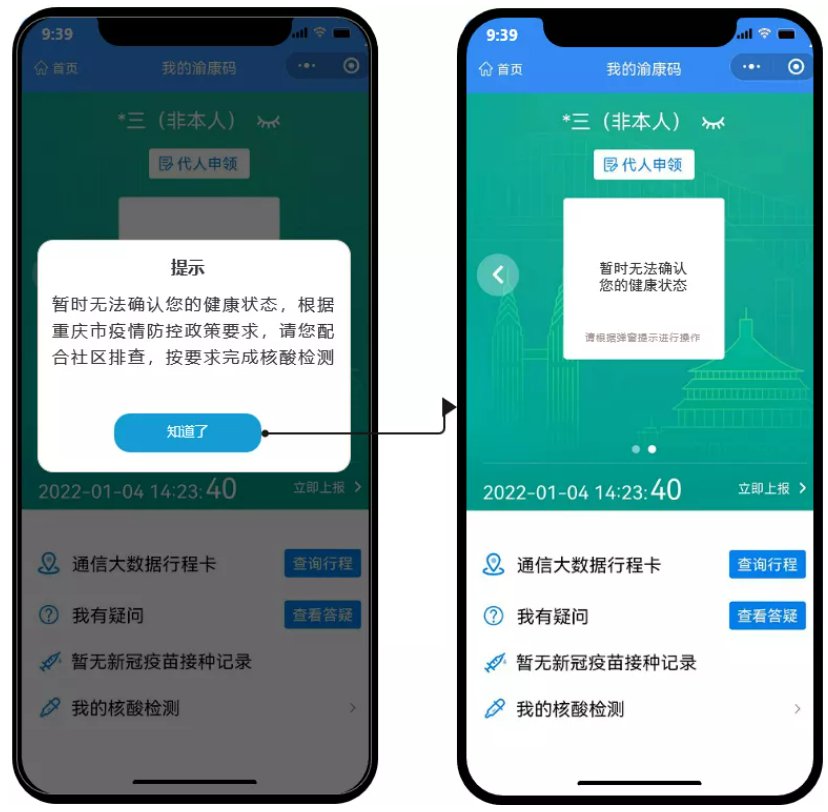 “渝康码”系统上线“弹窗”功能,对涉疫地区的来渝返渝人员进行“弹窗”提示,“弹窗”人员健康状态暂时无法确认,需配合社区排查报告健康状态,并按要求进行核酸检测。